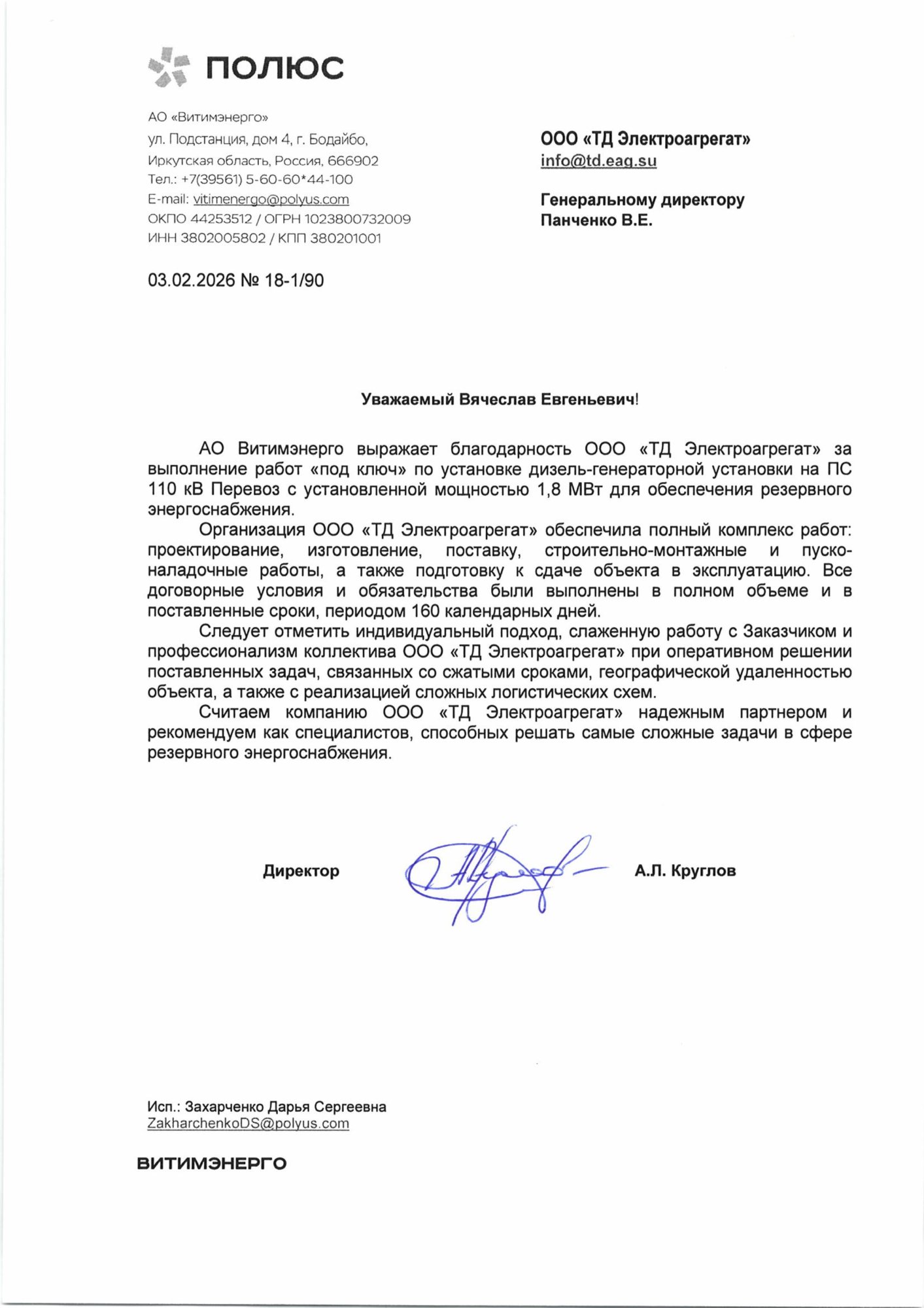 Благодарственное письмо от компании АО "Витимэнерго" за подписью директора - А.Л. Круглова