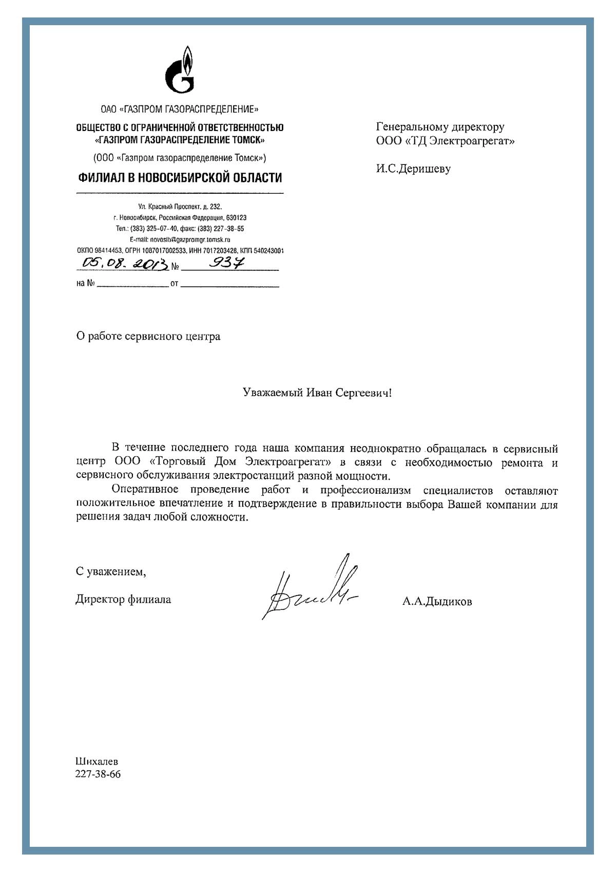 [ALT] => Отзыв контрагентов о компании ООО «ТД Электроагрегат» и исполненном проекте для ООО "Газпром газораспределение Томск" филиал Новосибирская обл.