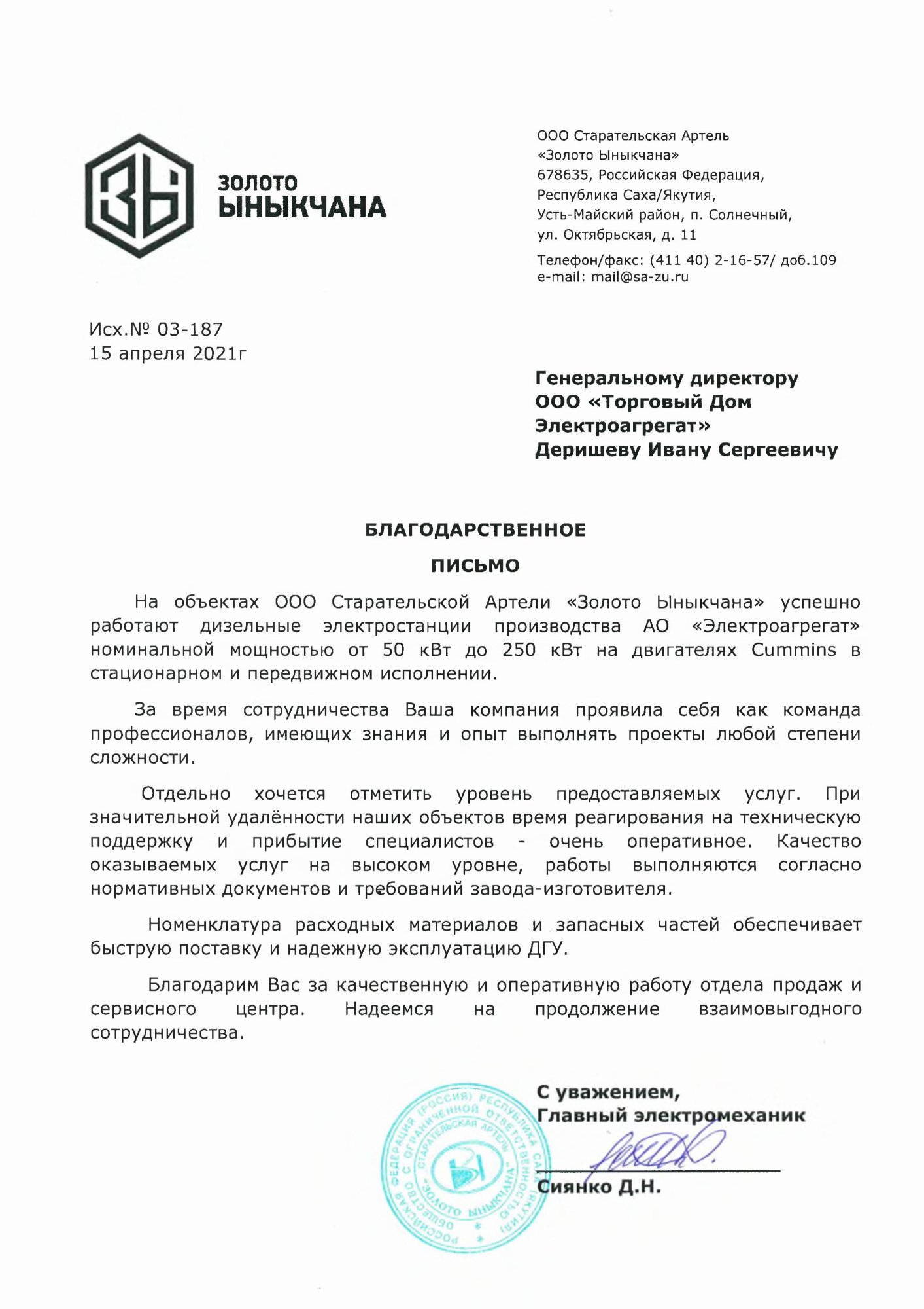 ) ) [reviewBody] => Генеральному директору завода "Торговый Дом Электроагрегат" Деришеву Ивану Сергеевичу БЛАГОДАРСТВЕННОЕ ПИСЬМО.    На объектах ООО Старательской Артели "Золото Ыныкчана" успешно работают дизельные электростанции производства завода "Электроагрегат" номинальной мощностью от 50 кВт до 250 кВт на двигателях Cummins в стационарном и передвижном исполнении.    За время сотрудничества Ваша компания проявила себя как команда профессионалов, имеющих знания и опыт выполнять проекты любой степени сложности.    Отдельно хочется отметить уровень предоставляемых услуг. При значительной удаленности наших объектов время реагирования на техническую поддержку и прибытие специалистов-очень оперативное. Качество оказываемых услуг на высоком уровне, работы выполняются согласно нормативных документов и требований завода-изготовителя.    Номенклатура расходных материалов и запасных частей обеспечивает быструю поставку и надежную эксплуатацию ДГУ.    Благодарим Вас за качественную и оперативную работу отдела продаж и сервисного центра. Надеемся на продолжение взаимовыгодного сотрудничества. С уважением, Главный электромеханик Сиянко Д.Н. ) ) )